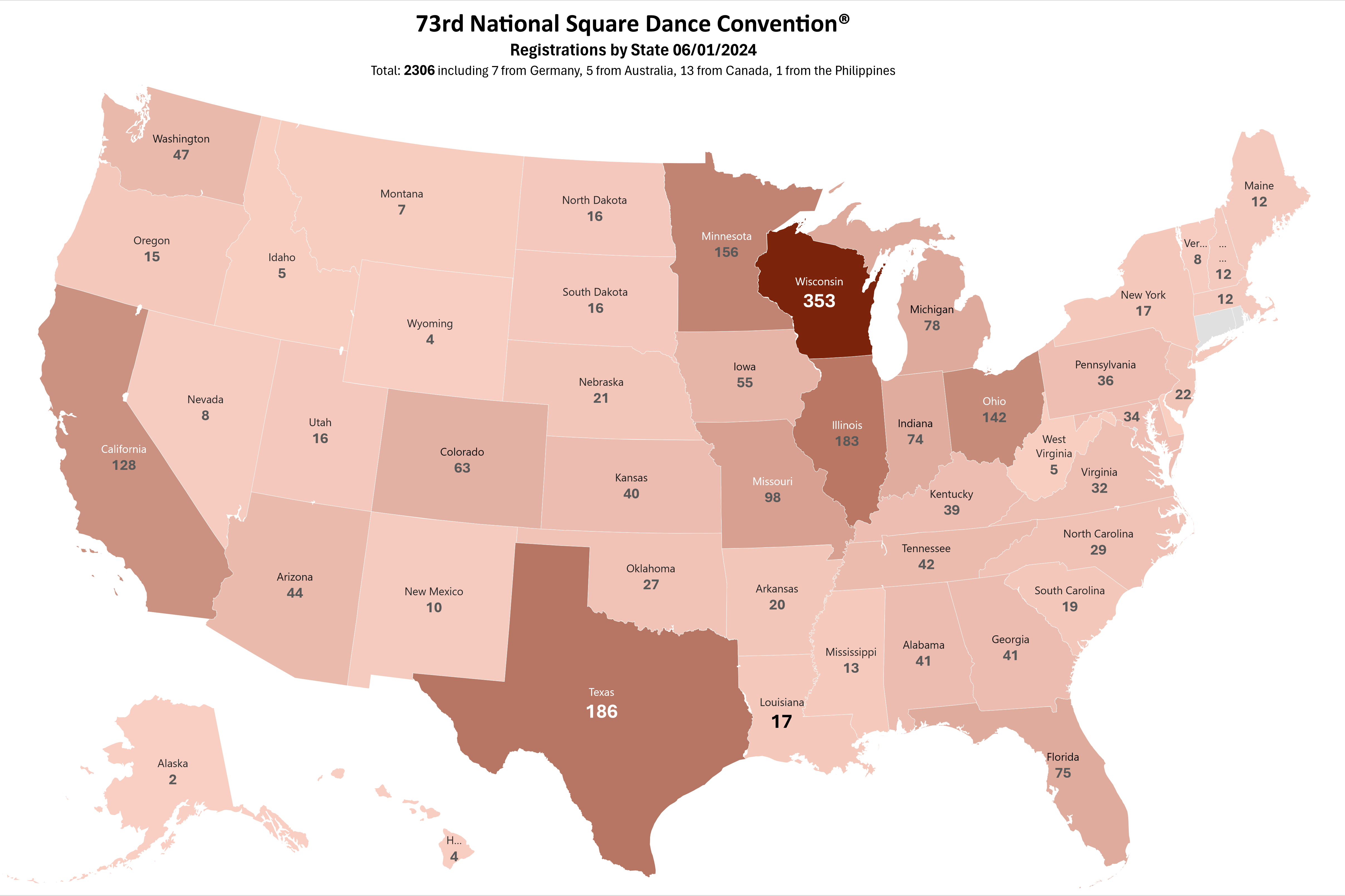 2358 Registered dancers including 7 from Germany, 6 from Australia, 13 from Canada and 1 from the Philippines as of June 21st, 2024.